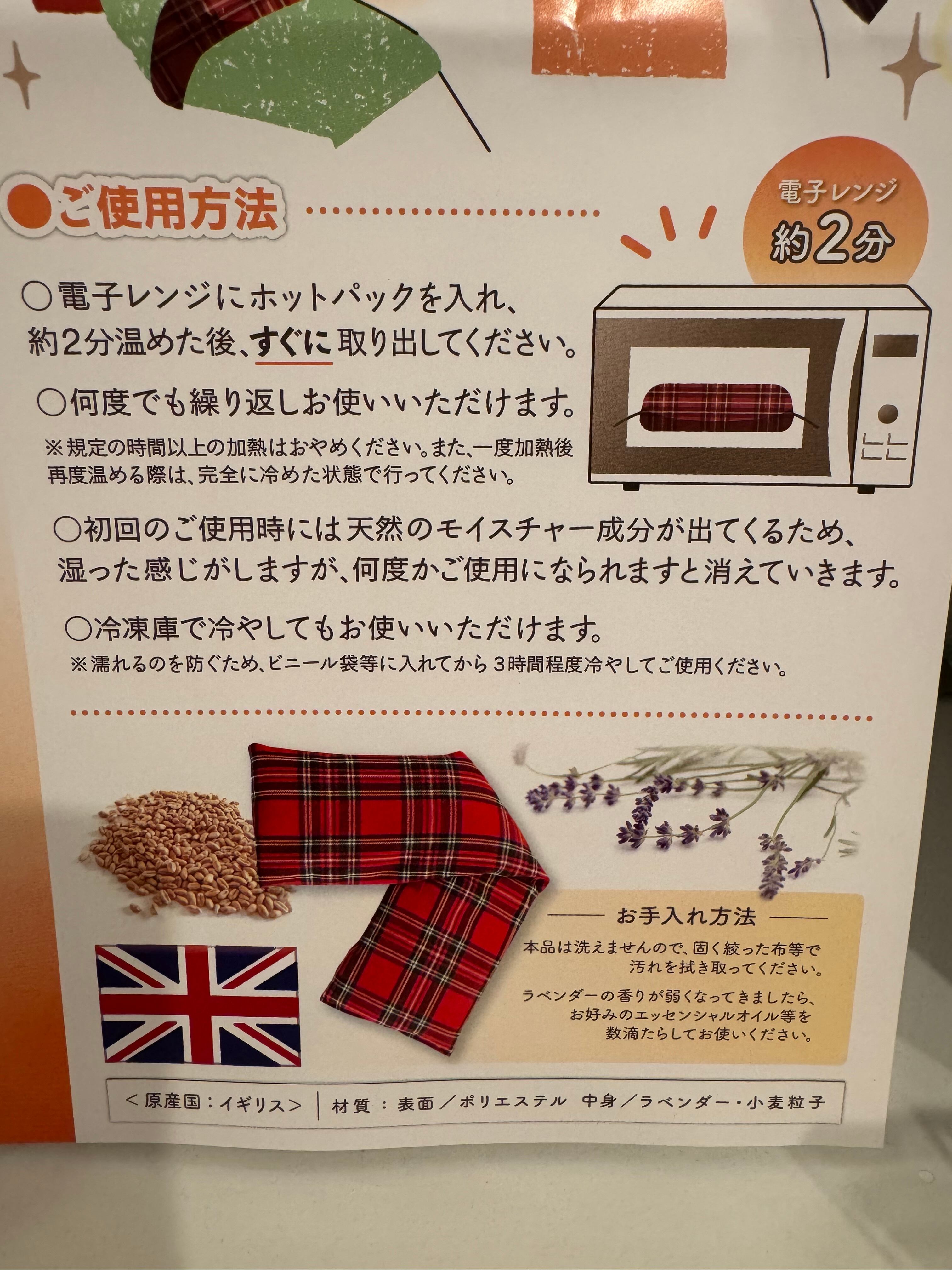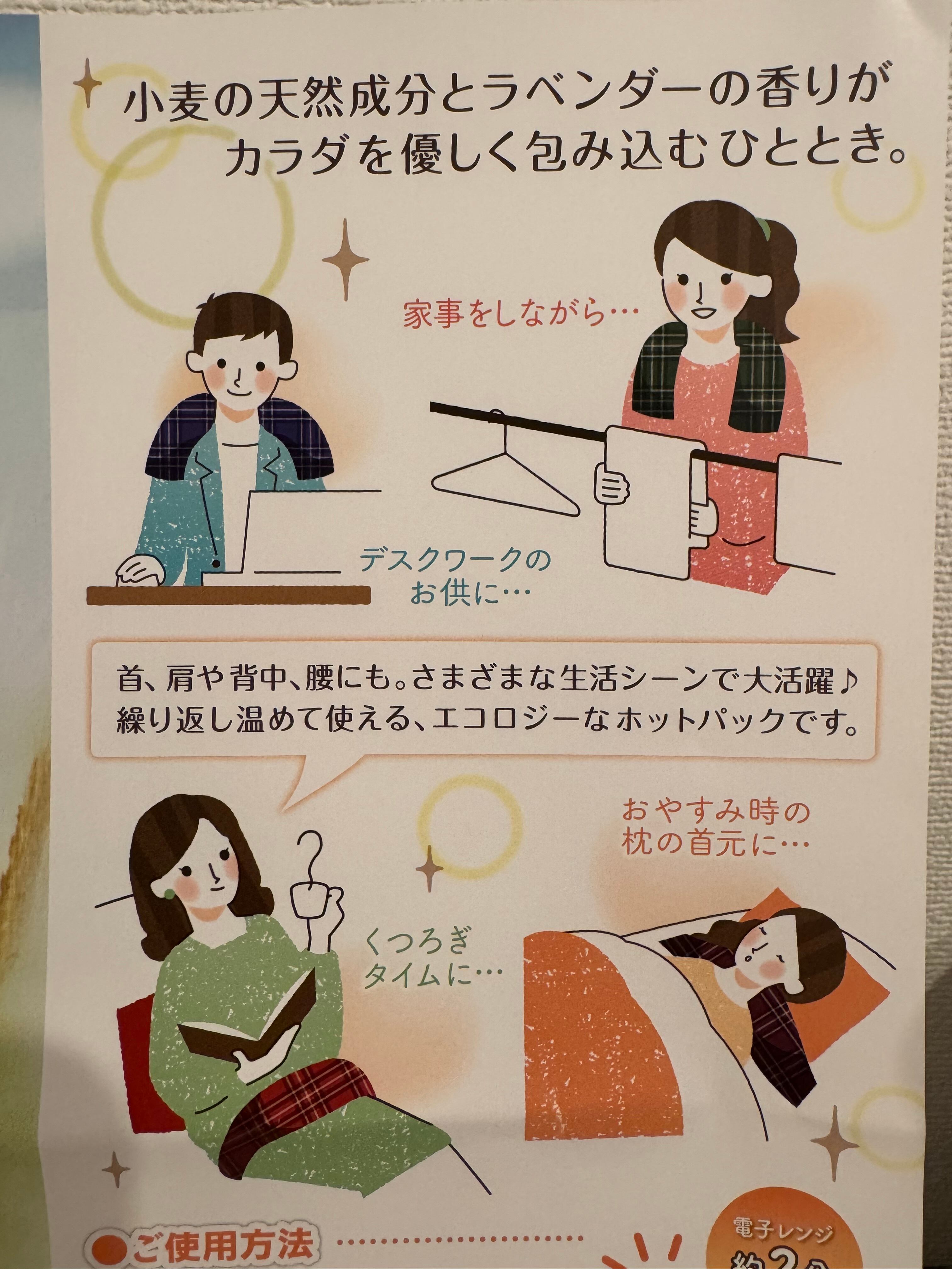 中身は小麦とラベンダーで、使い始めはラベンダーがほのかに香りますが、使っているうちに香りはなくなります
